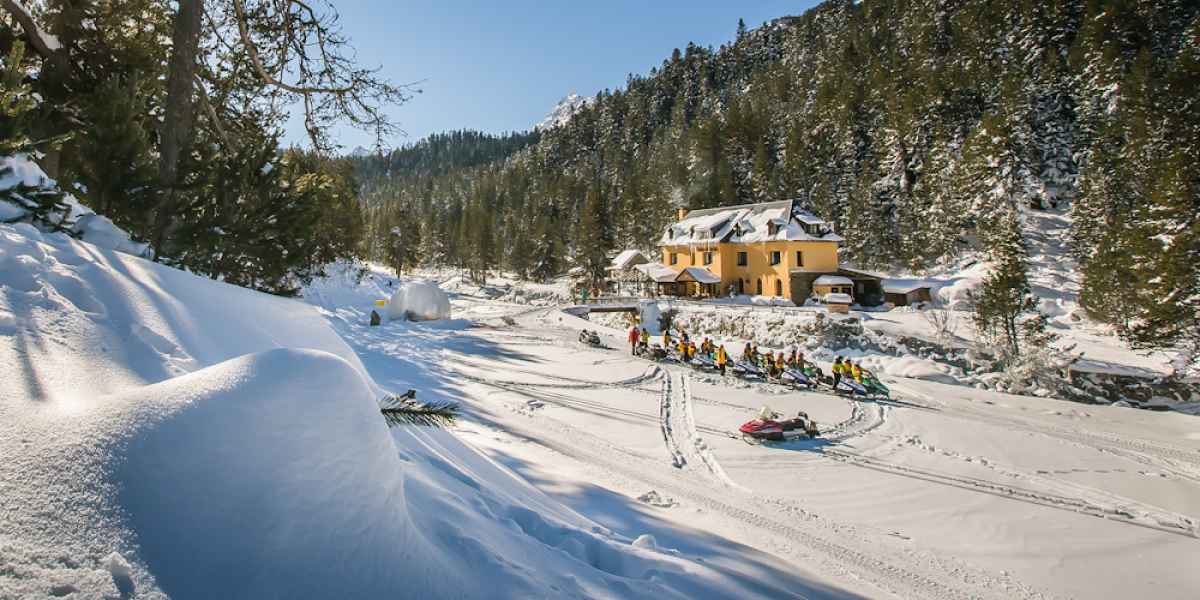 ¡Siente la adrenalina con nuestra aventura en moto de nieve de 1 hora y 30 min. en la zona periférica del Parque Nacional de Aigüestortes! Excursión en moto de nieve de 14km ida y vuelta por el Valle de Aigüamòg hasta el área de la Montanheta.